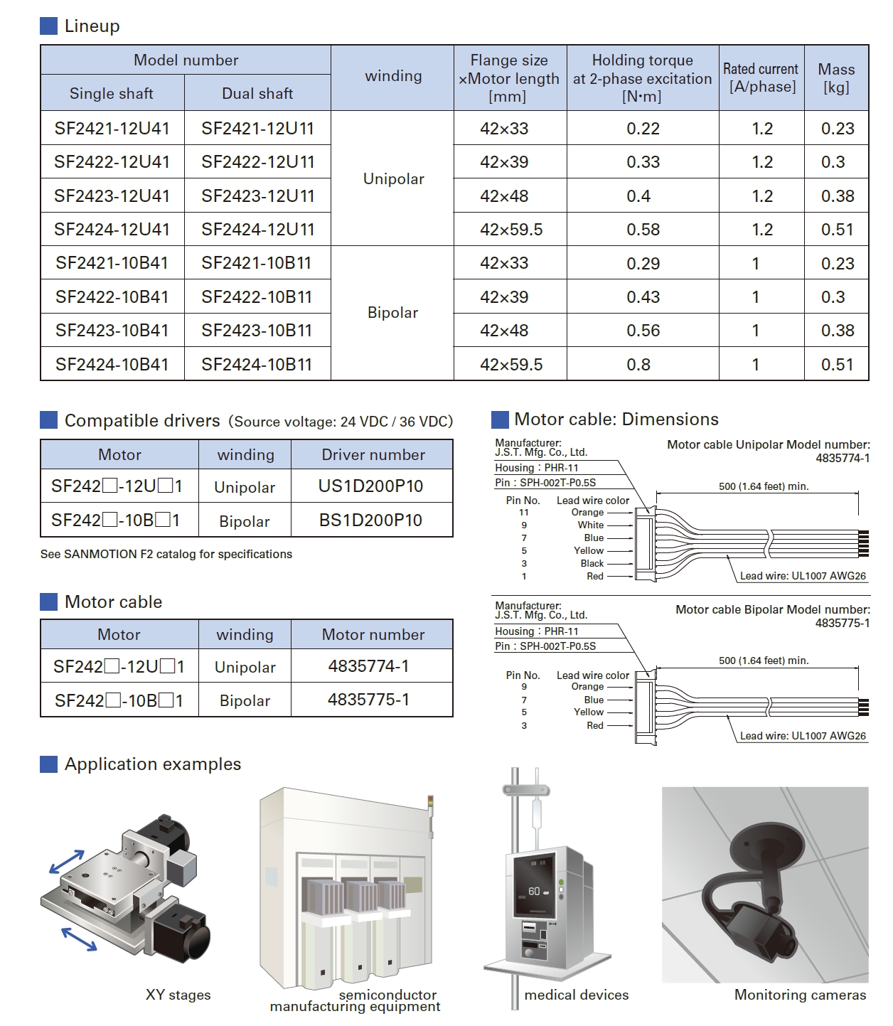 The SF2424-10B41 variant represents the highest torque among the 42 mm bipolar SF242x-10B41 lineup, making it ideal for applications requiring stronger holding torque without sacrificing compactness.