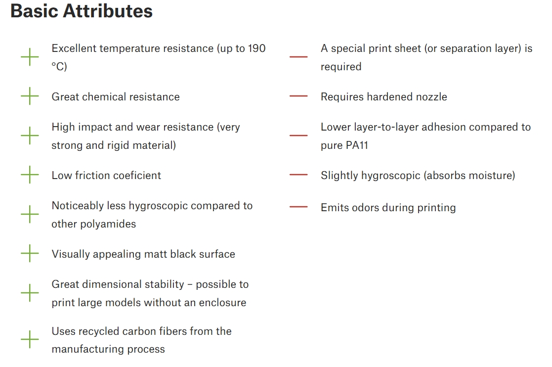 Prusament PA11 (Nylon) Carbon Fiber is an ideal filament for prototypes in the automotive, aerospace, and hobby industries, given its excellent resistance to heat, chemicals, and mechanical stress. Among the Prusament filaments, PA11-CF has by far the best temperature and chemical resistance. 3D-printed parts withstand up to 190 °C (depending on stress) and have increased resistance to many solvents (NaOH, Methanol, Ethanol, Toluene, Acetone, motor oils, benzene, diesel, etc.). PA11-CF is a material made from castor oil, the carbon fibers used for this material are recycled, the same as for the Prusament PC Blend Carbon Fiber. The best use of the PA11-CF is for making special chemically, mechanically, and heat-stressed parts, such as car engine components.